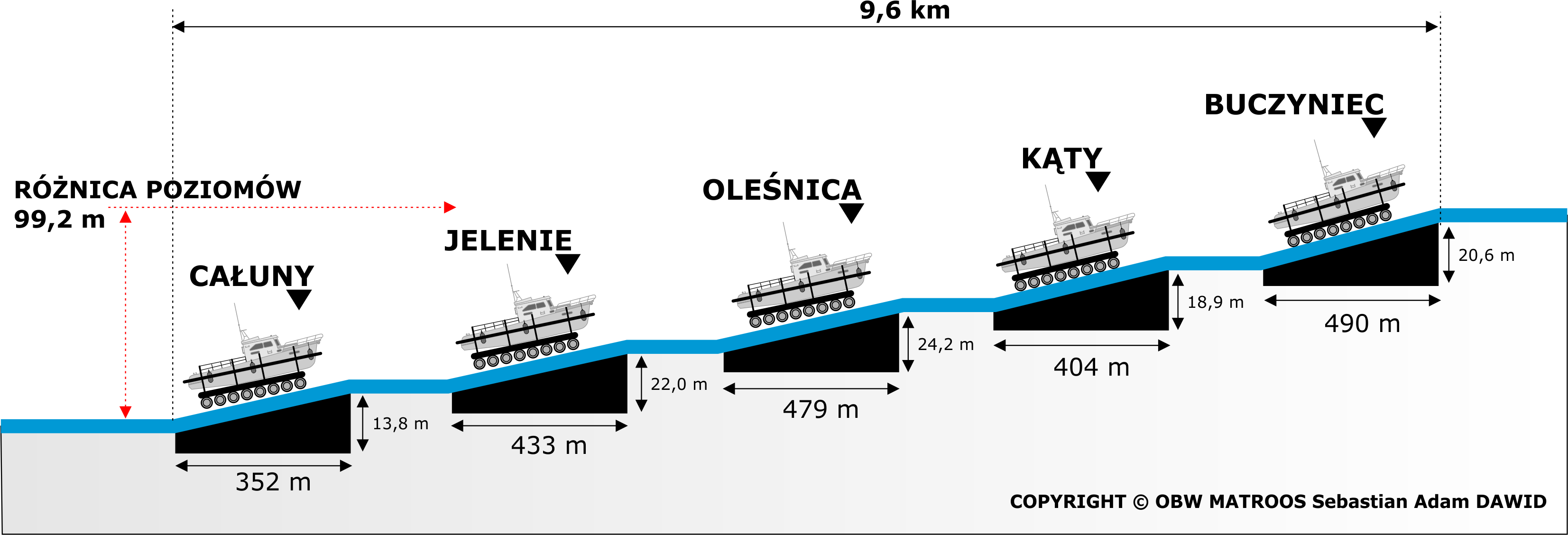 Różnica poziomów między pochylnią Całuny, a pochylnią Buczyniec wynosi 99,2 metra i rozciąga się na długości 9,6 km.